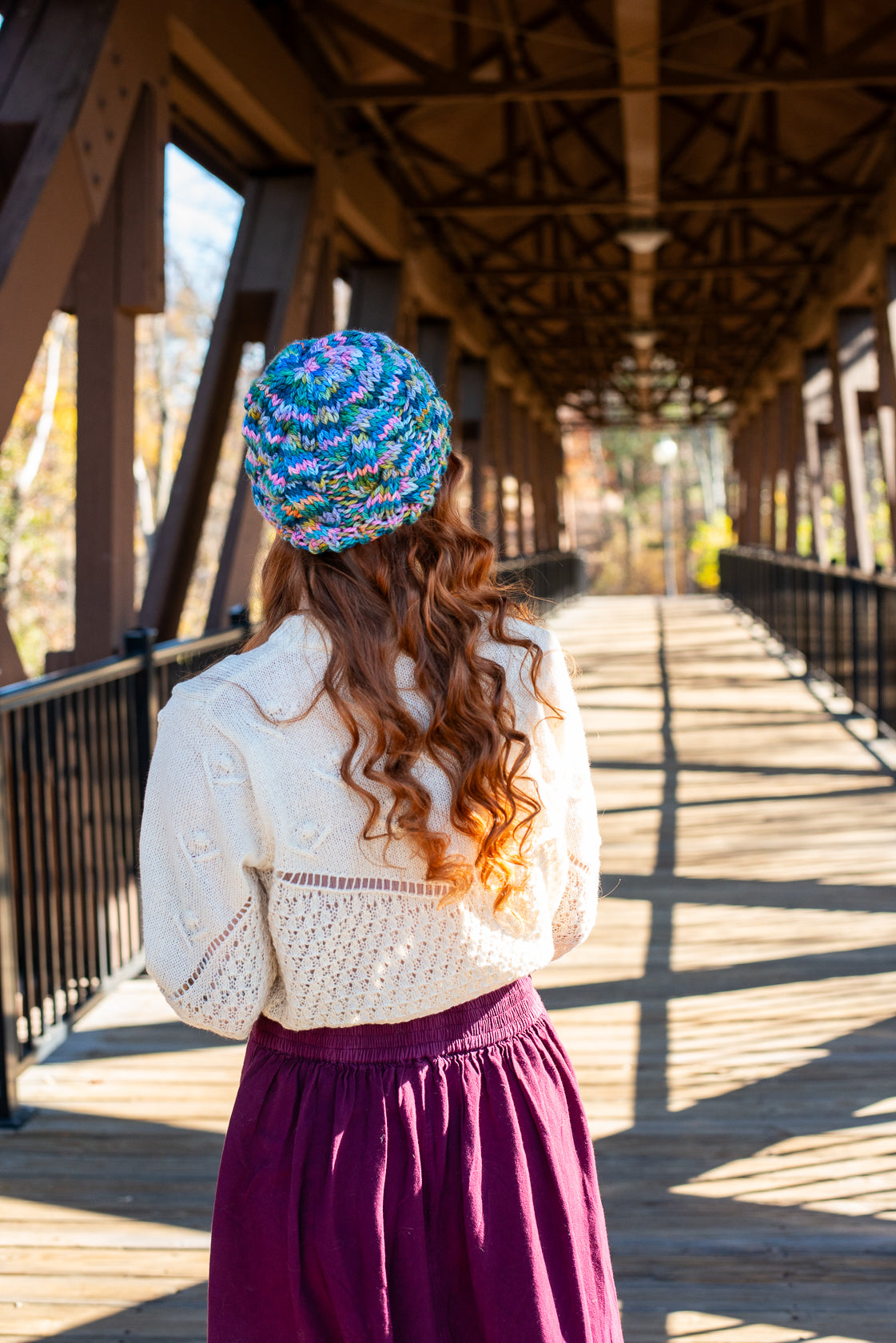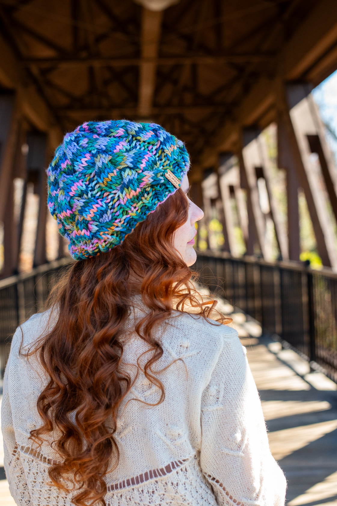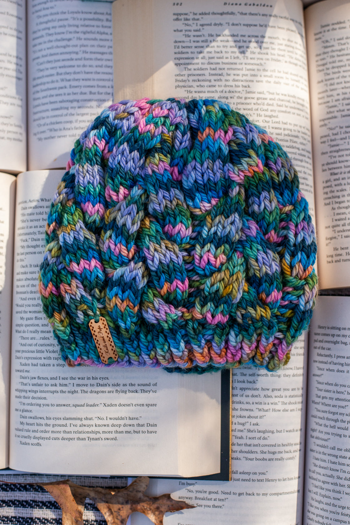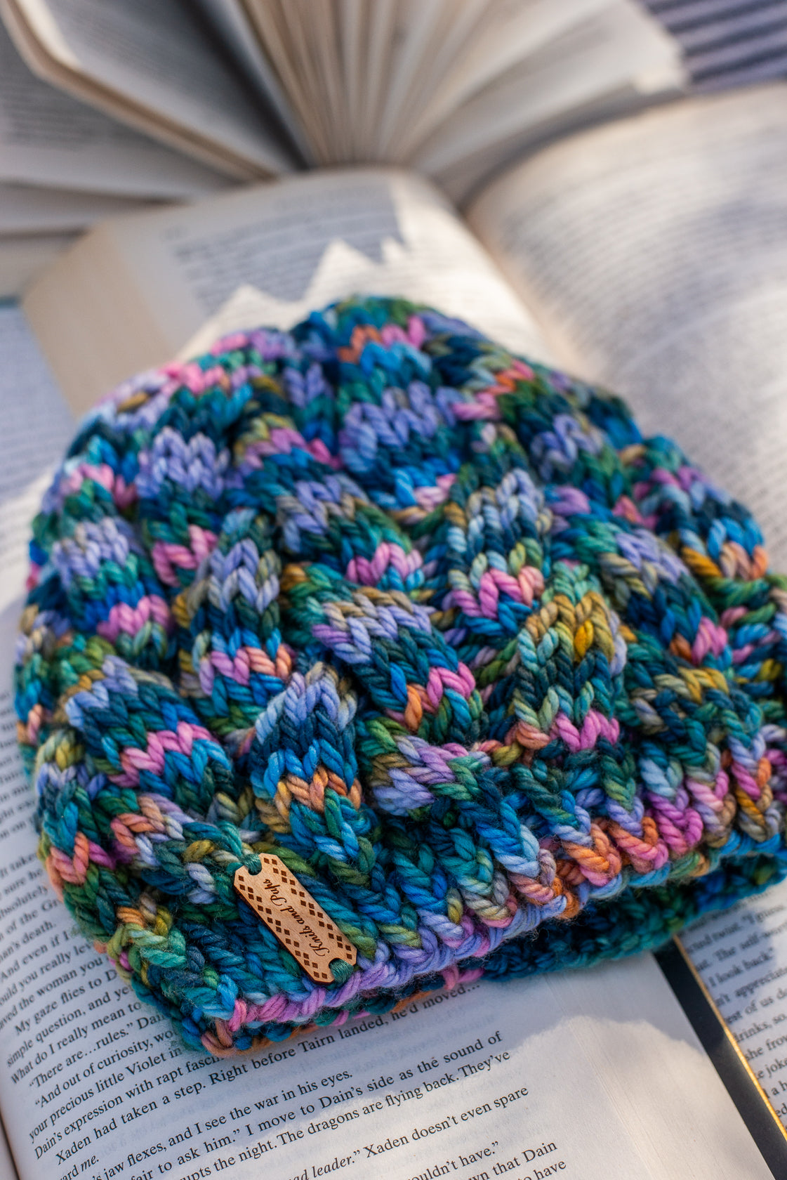 All one of a kind hats are knit with hand dyed, 100% merino wool. Because of how the wool we use is dyed by hand, each skein is unique. Combined with the braided pattern, even if we use the same colorway, each hat is totally one of a kind.