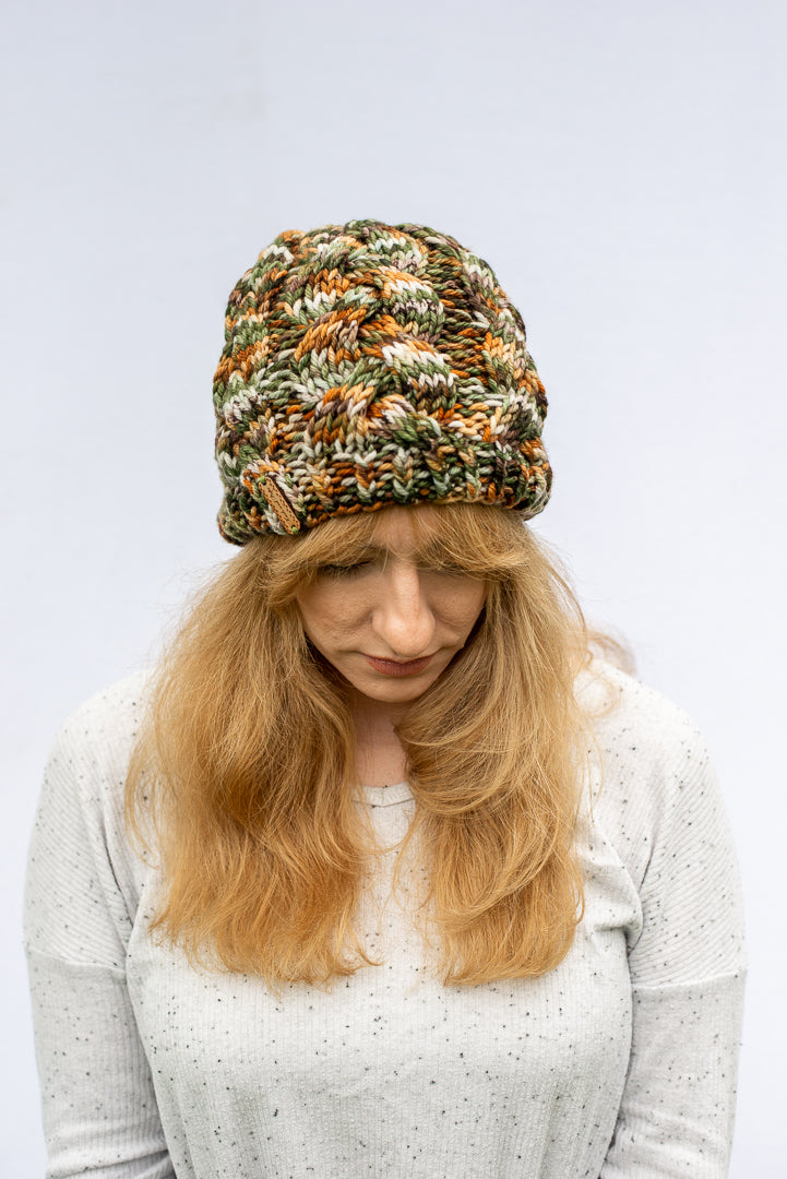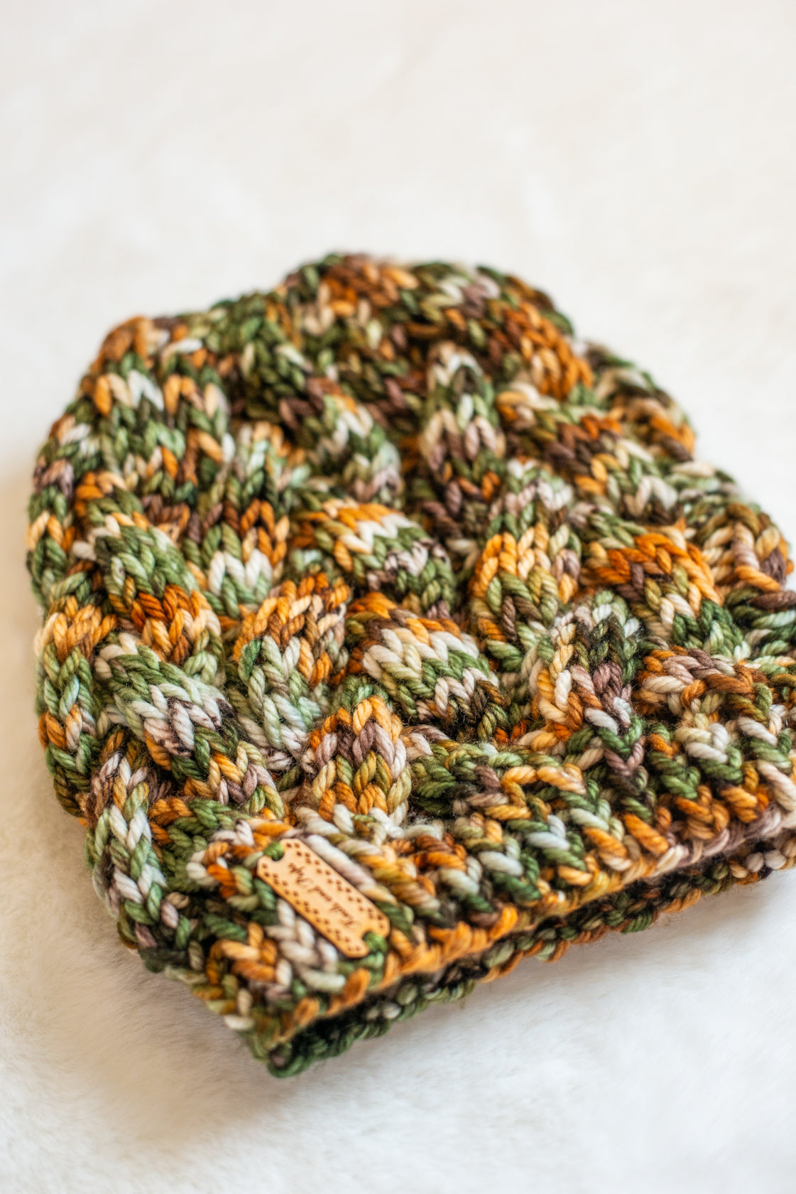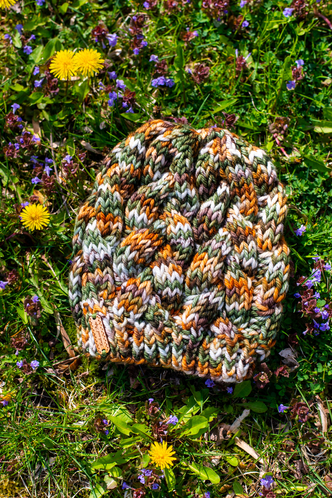 All one of a kind hats are knit with hand dyed, 100% merino wool. Because of how the wool we use is dyed by hand, each skein is unique. Combined with the braided pattern, even if we use the same colorway, each hat is totally one of a kind.