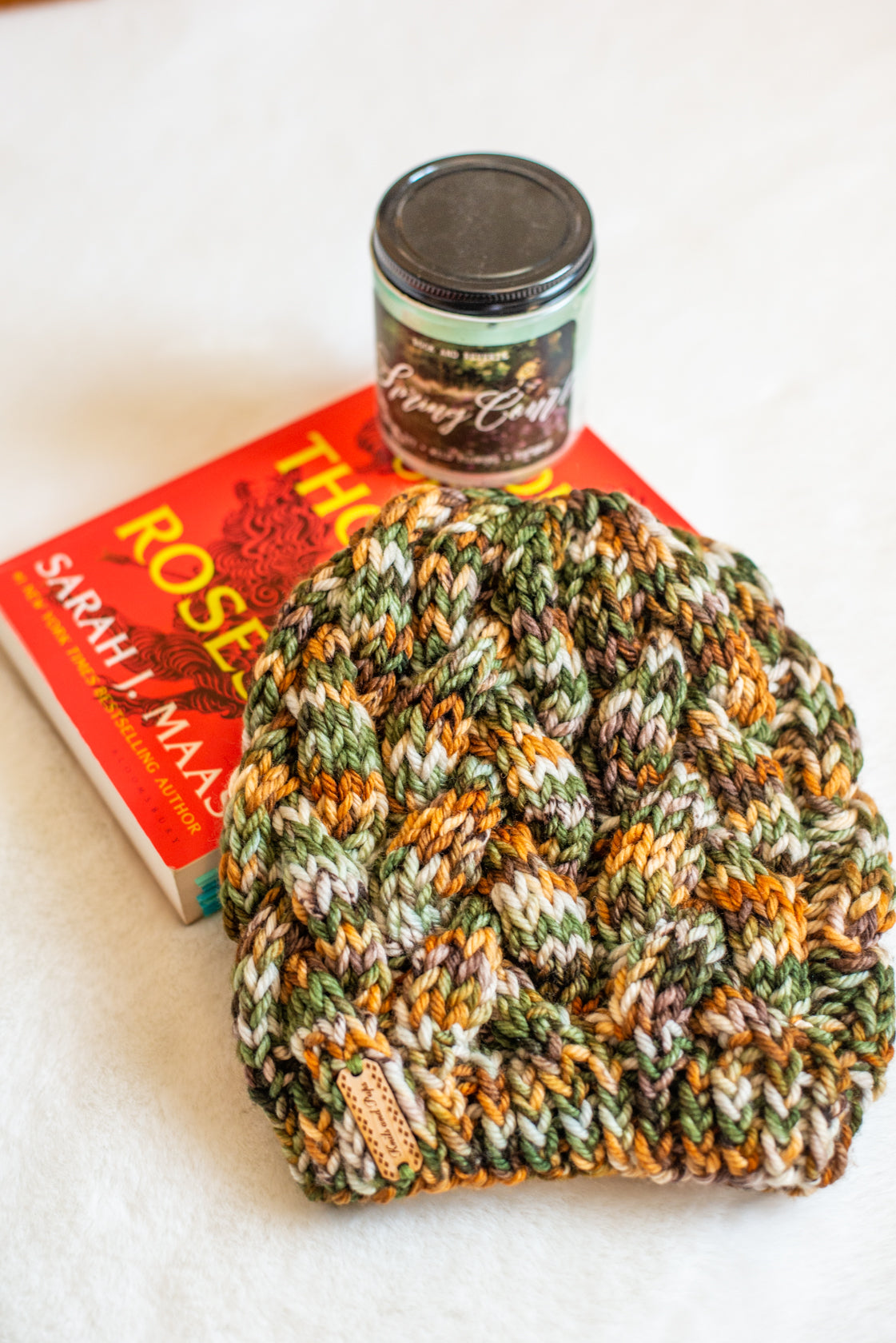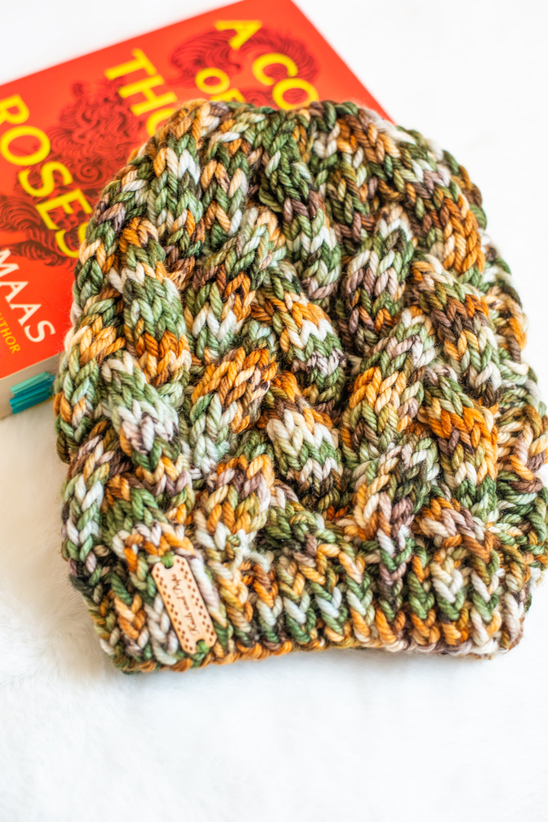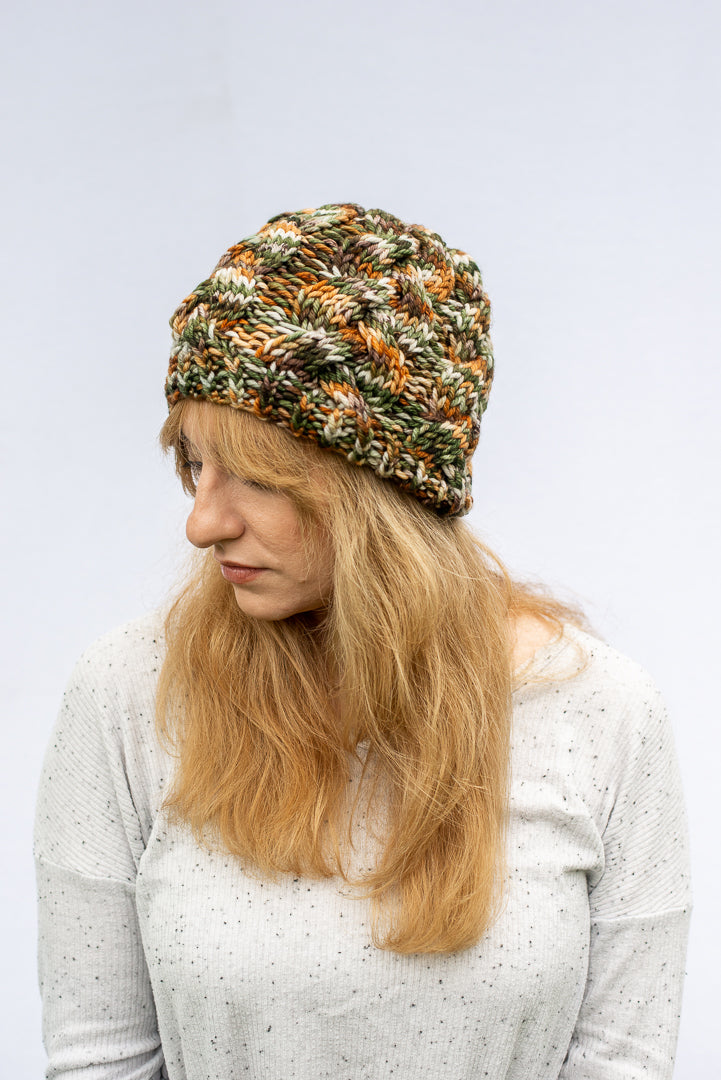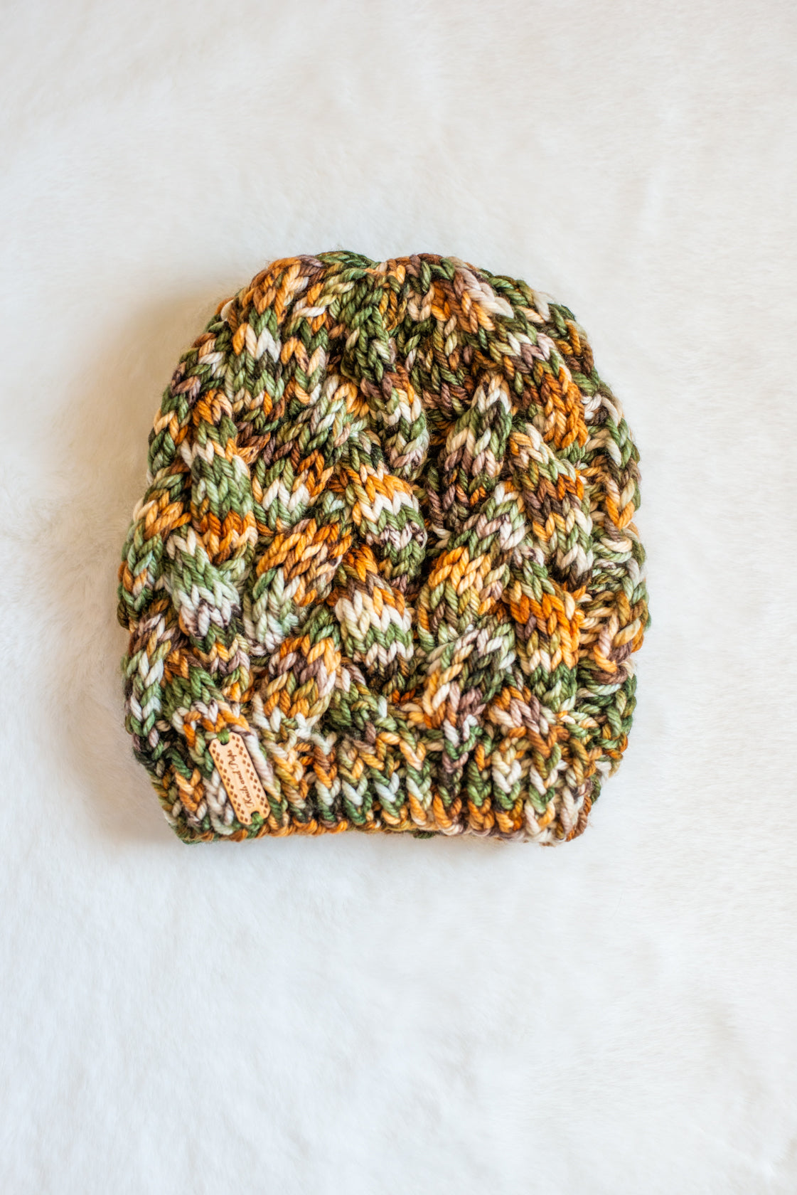 All one of a kind hats are knit with hand dyed, 100% merino wool. Because of how the wool we use is dyed by hand, each skein is unique. Combined with the braided pattern, even if we use the same colorway, each hat is totally one of a kind.