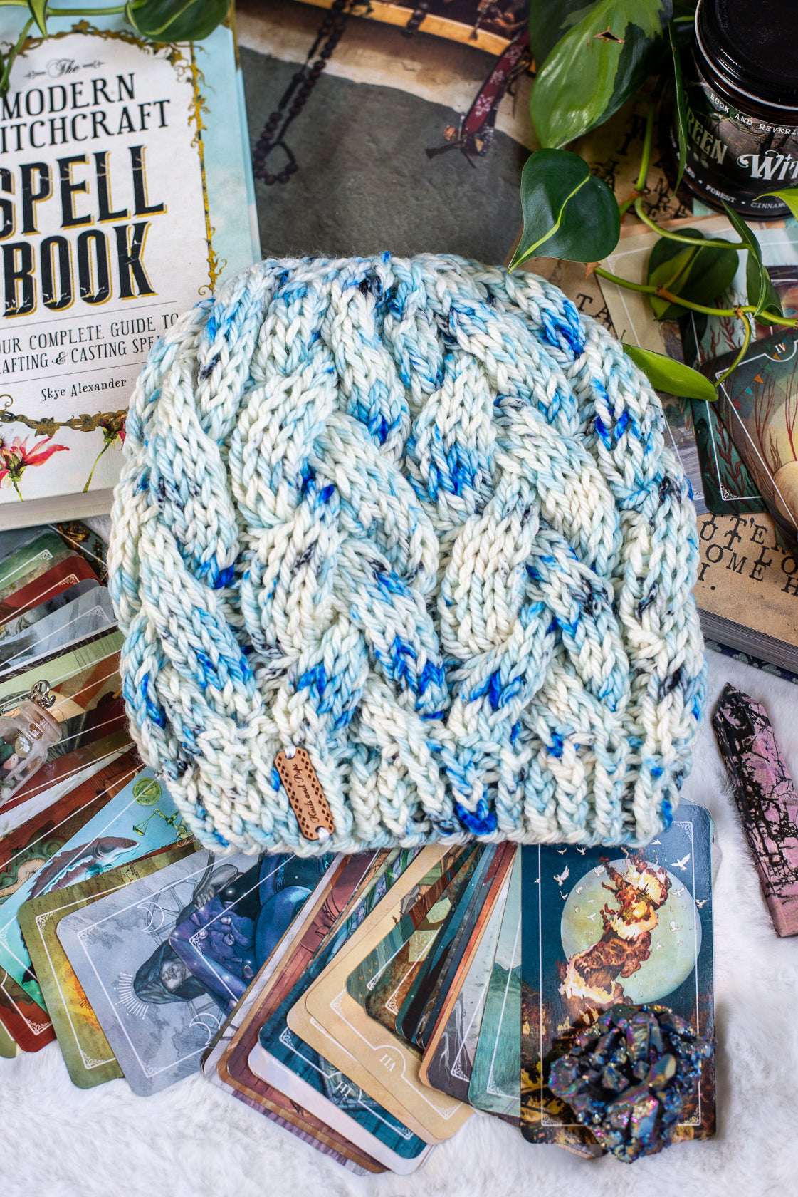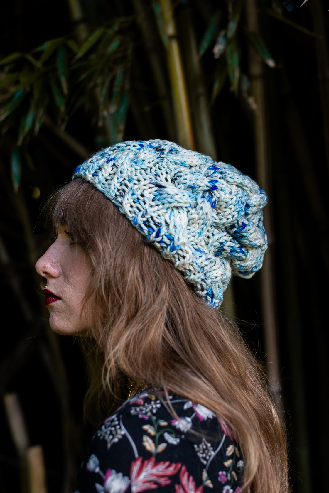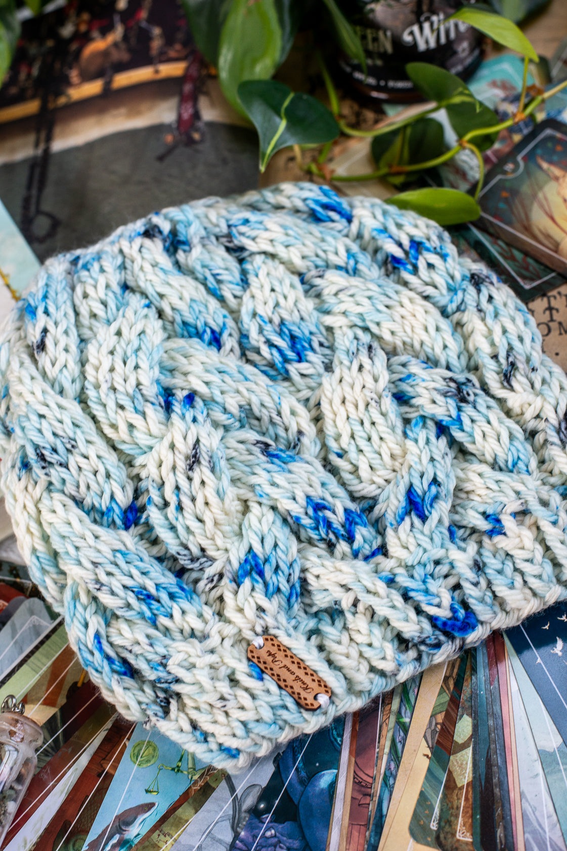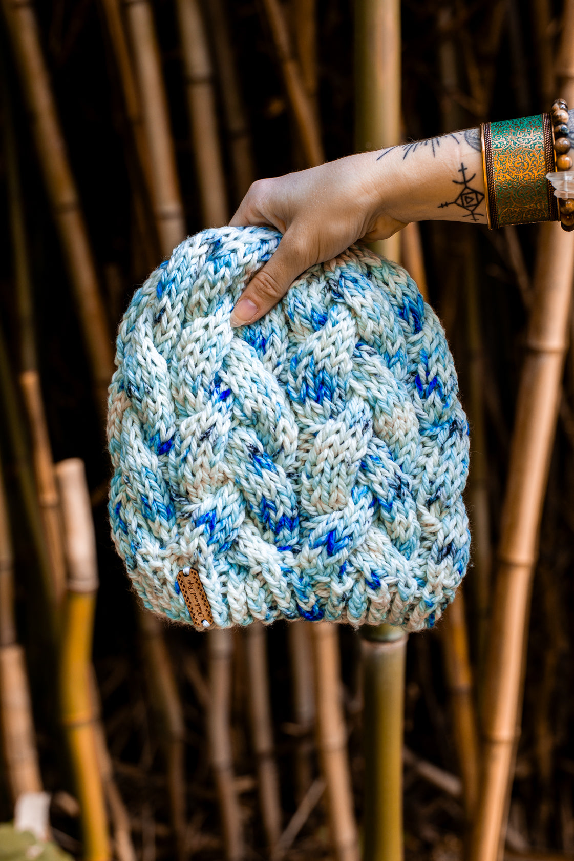 All one of a kind hats are knit with hand dyed, 100% merino wool. Because of how the wool we use is dyed by hand, each skein is unique. Combined with the braided pattern, even if we use the same colorway, each hat is totally one of a kind.
