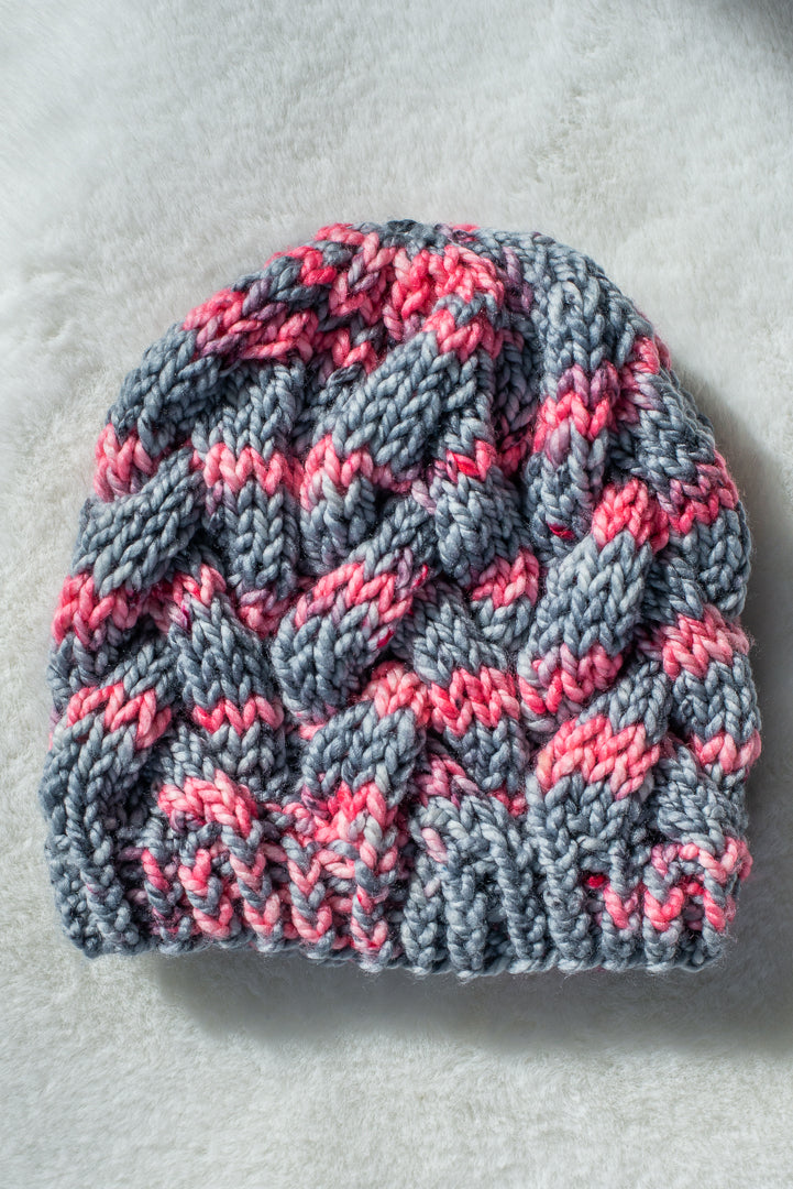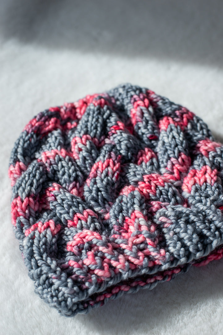 All one of a kind hats are knit with hand dyed, 100% merino wool. Because of how the wool we use is dyed by hand, each skein is unique. Combined with the braided pattern, even if we use the same colorway, each hat is totally one of a kind.