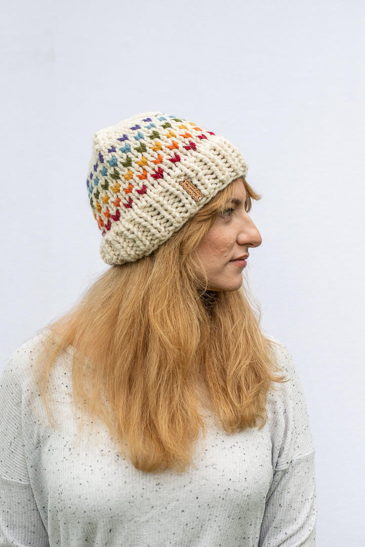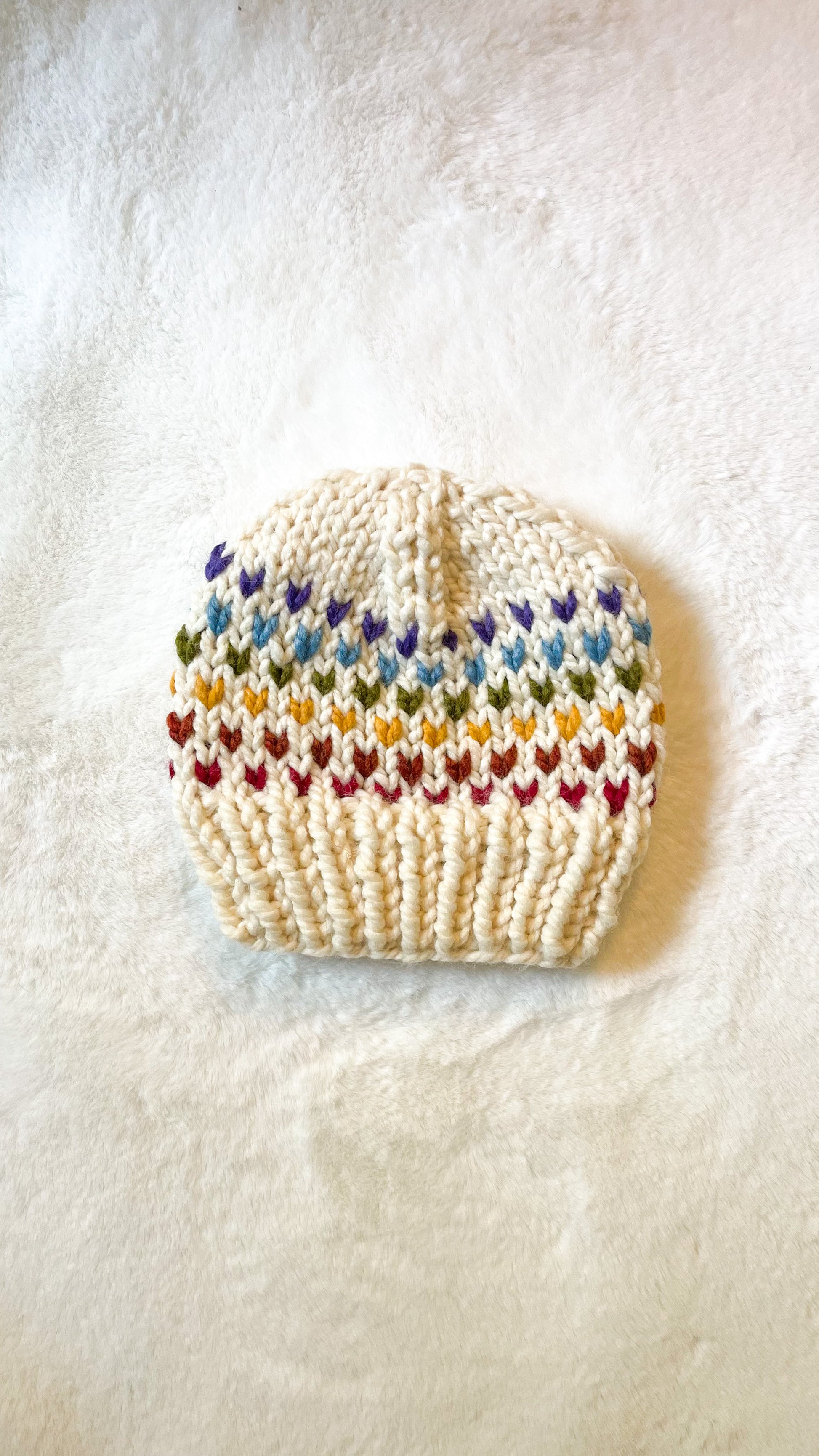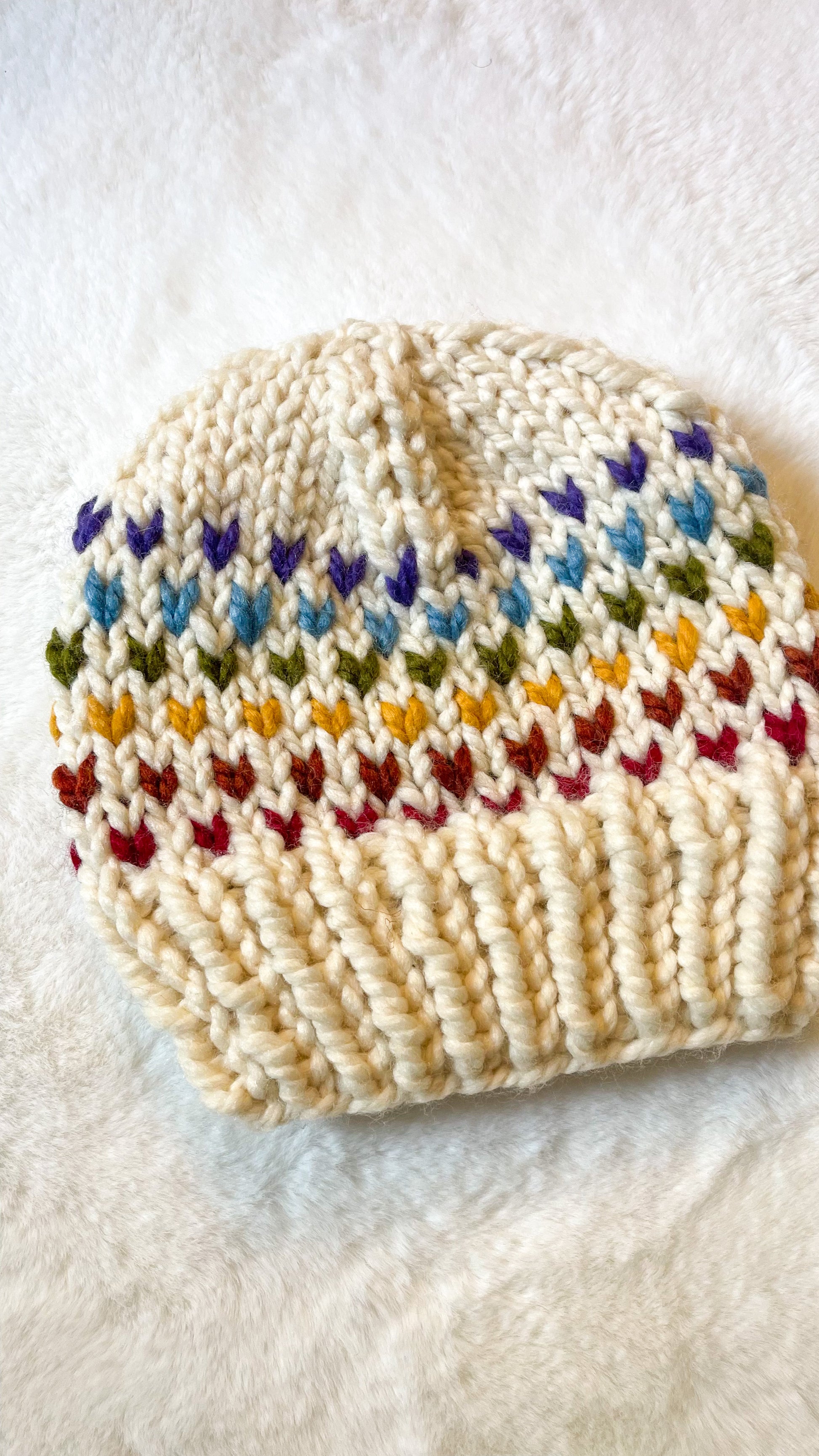 Stay cute and cozy all season with this hand knit, chunky beanie. Featuring a Pride Flag inspired design, wearing this beanie will show your support for all LGBTQIA+ People around the world.