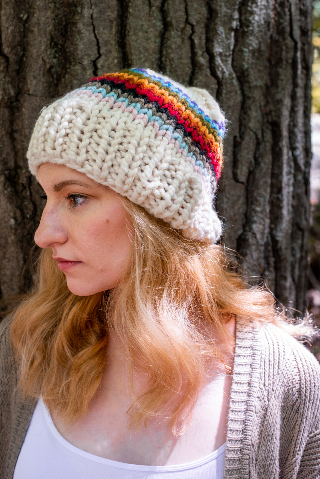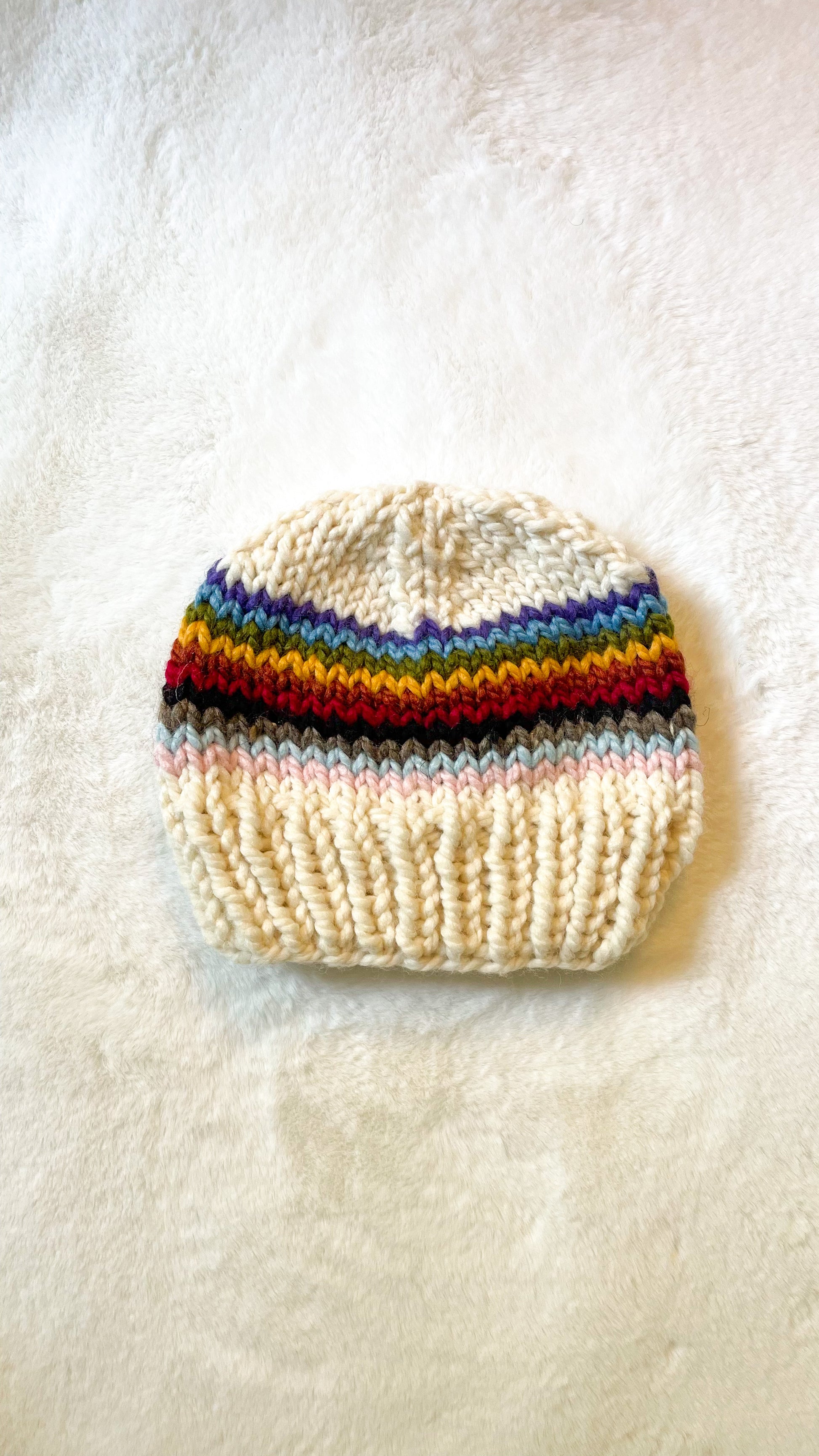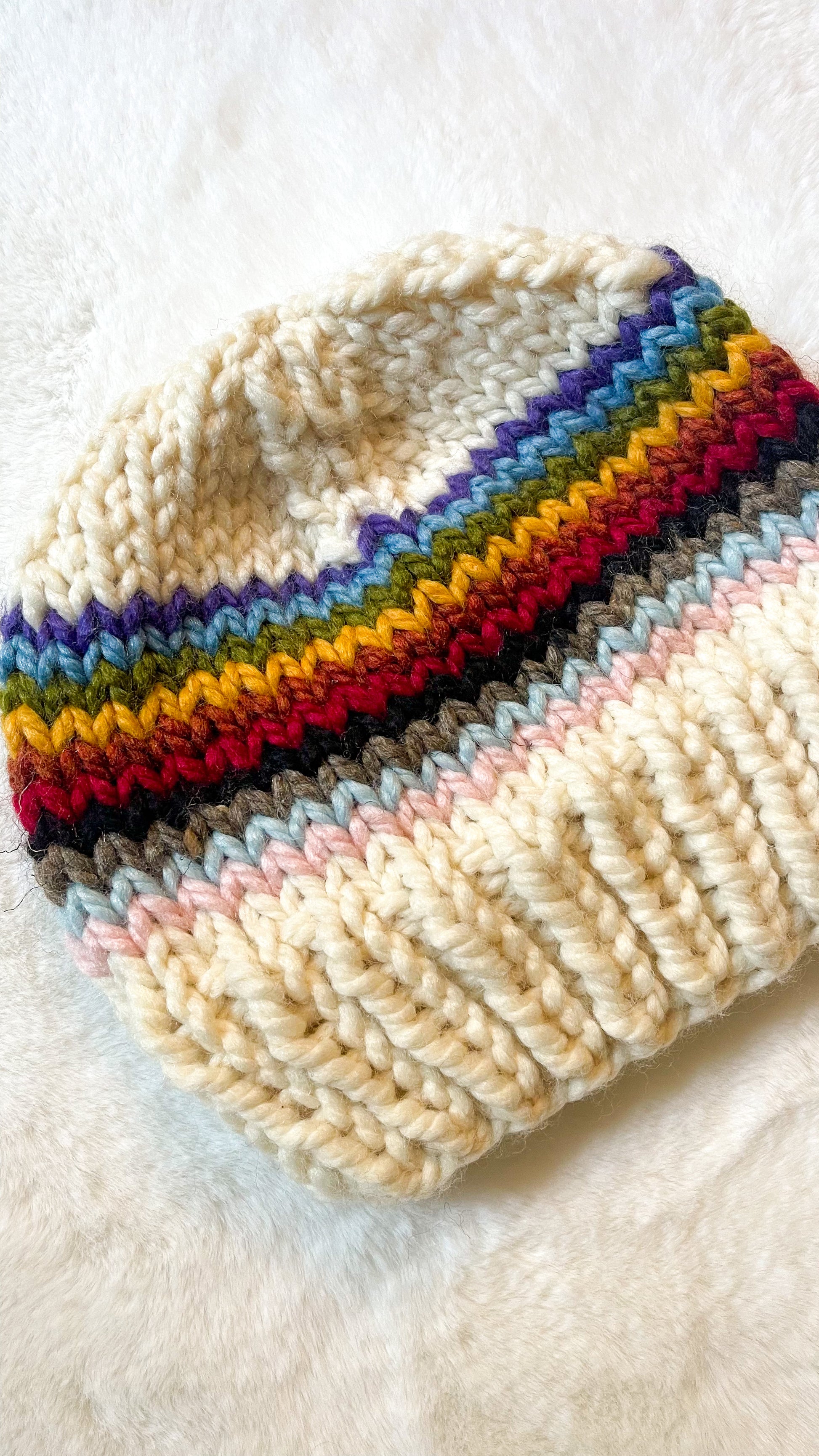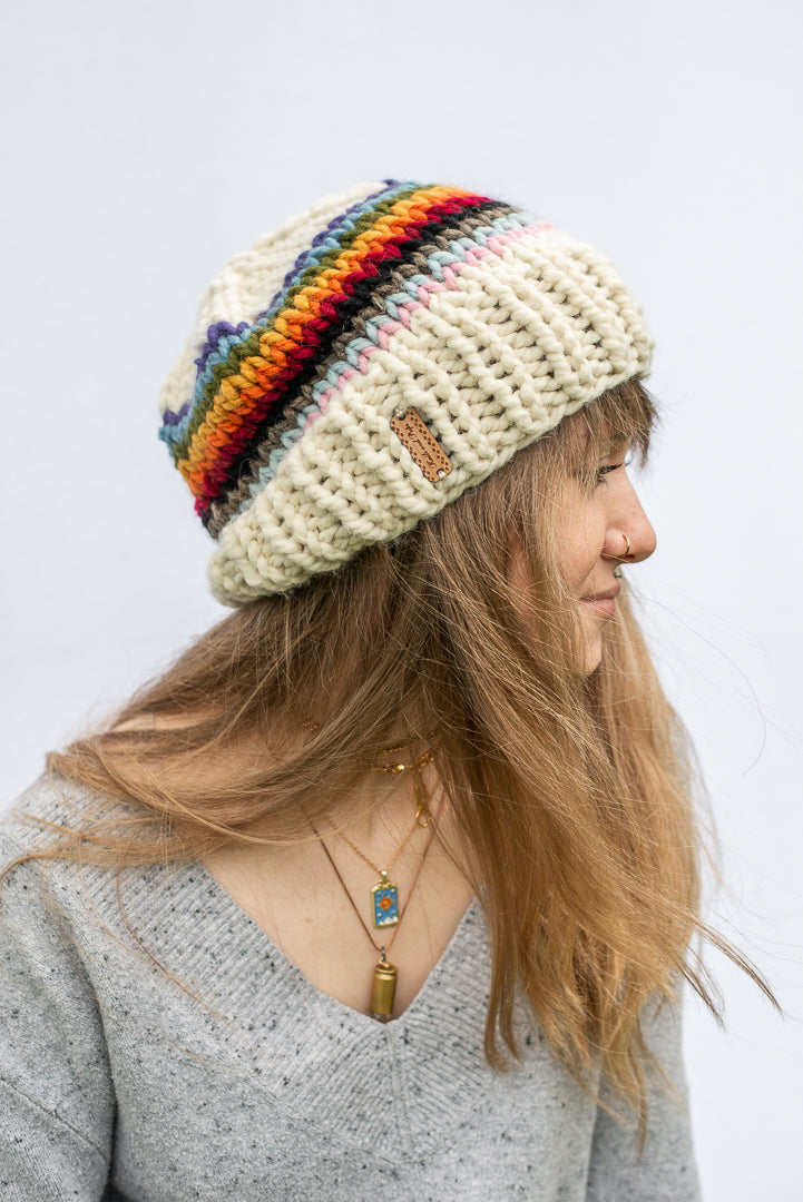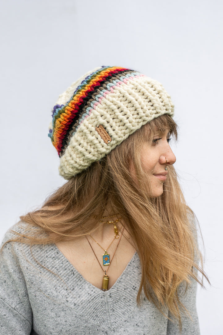 Stay cute and cozy all season with this hand knit, chunky beanie. Featuring a Progress Flag inspired design, wearing this beanie will show your support for all LGBTQIA+ People around the world.