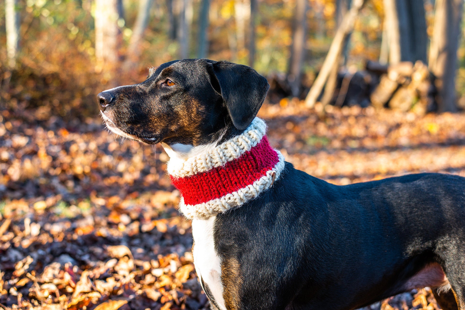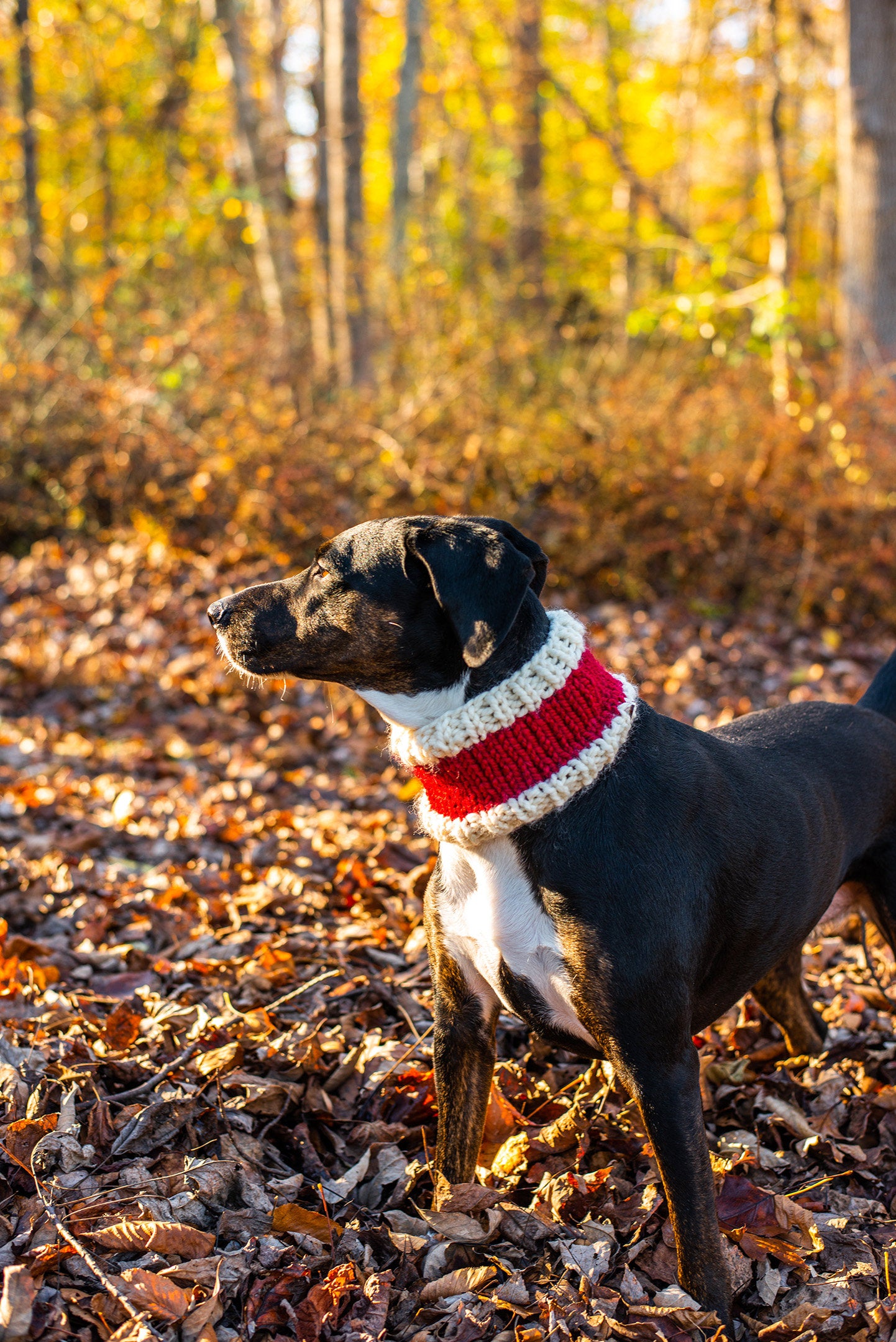 Keep your dog cozy and stylish in this handmade cowl. Featuring a Santa inspired design, pop it on and head out for a hike!