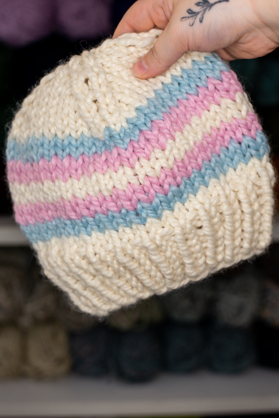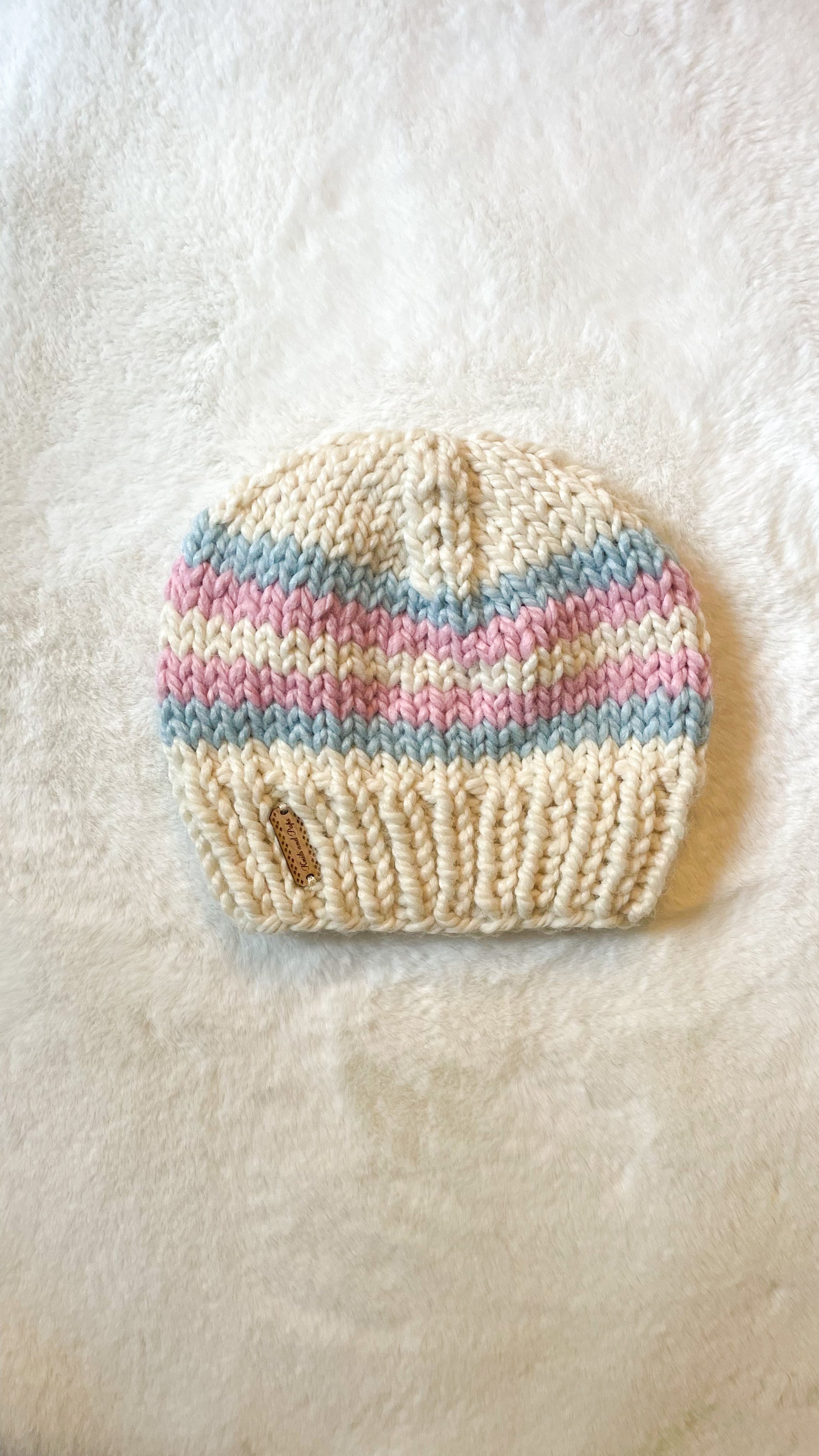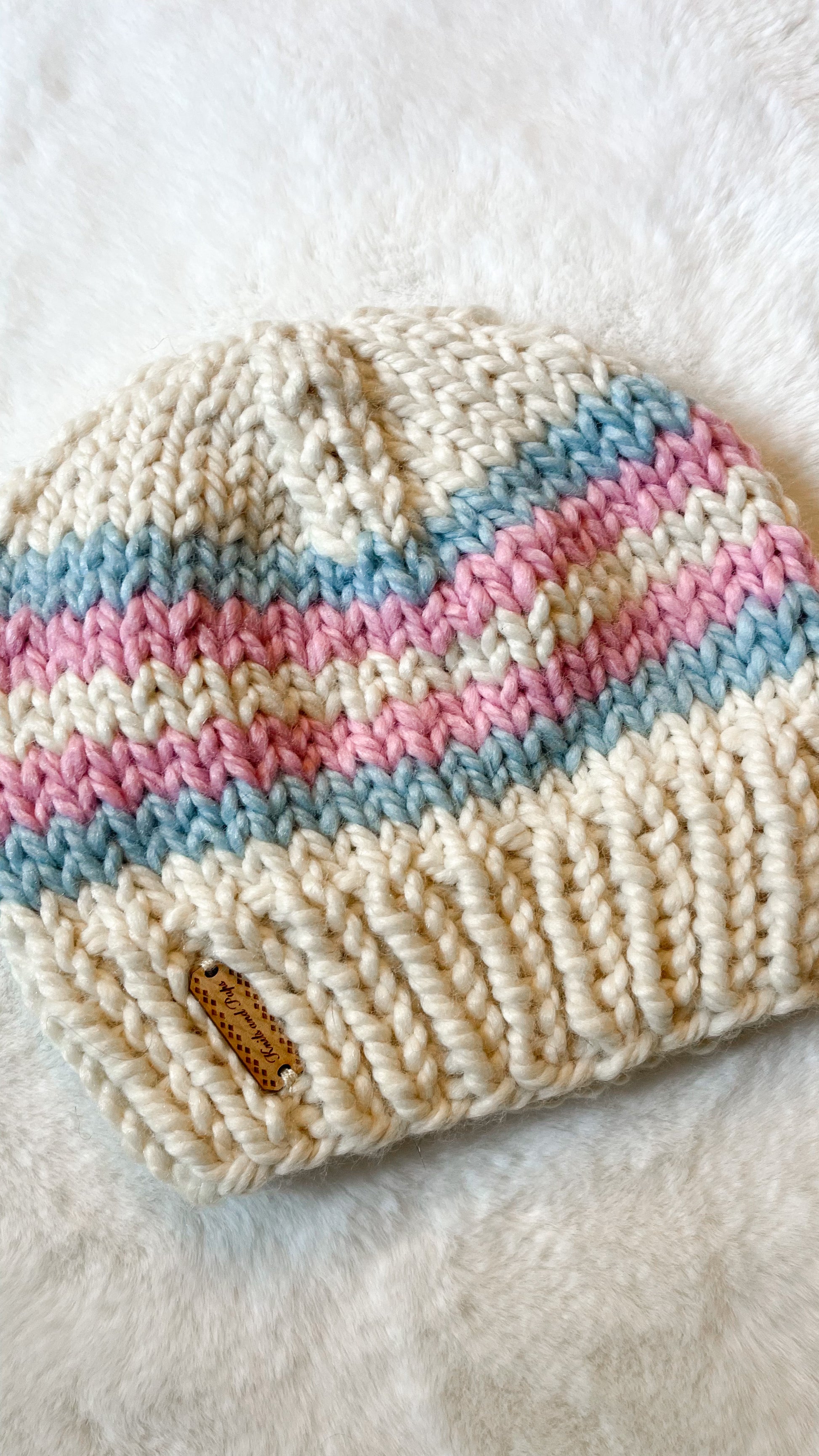 Stay cute and cozy all season with this hand knit, chunky beanie. Featuring a Trans Flag inspired design, wearing this beanie will show your support for Trans People around the world.