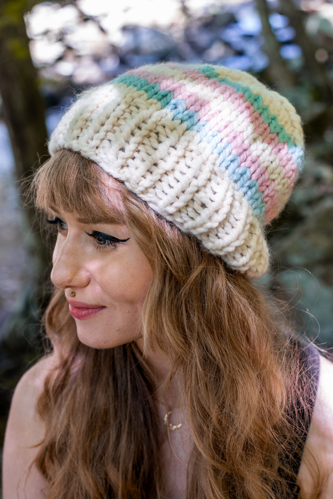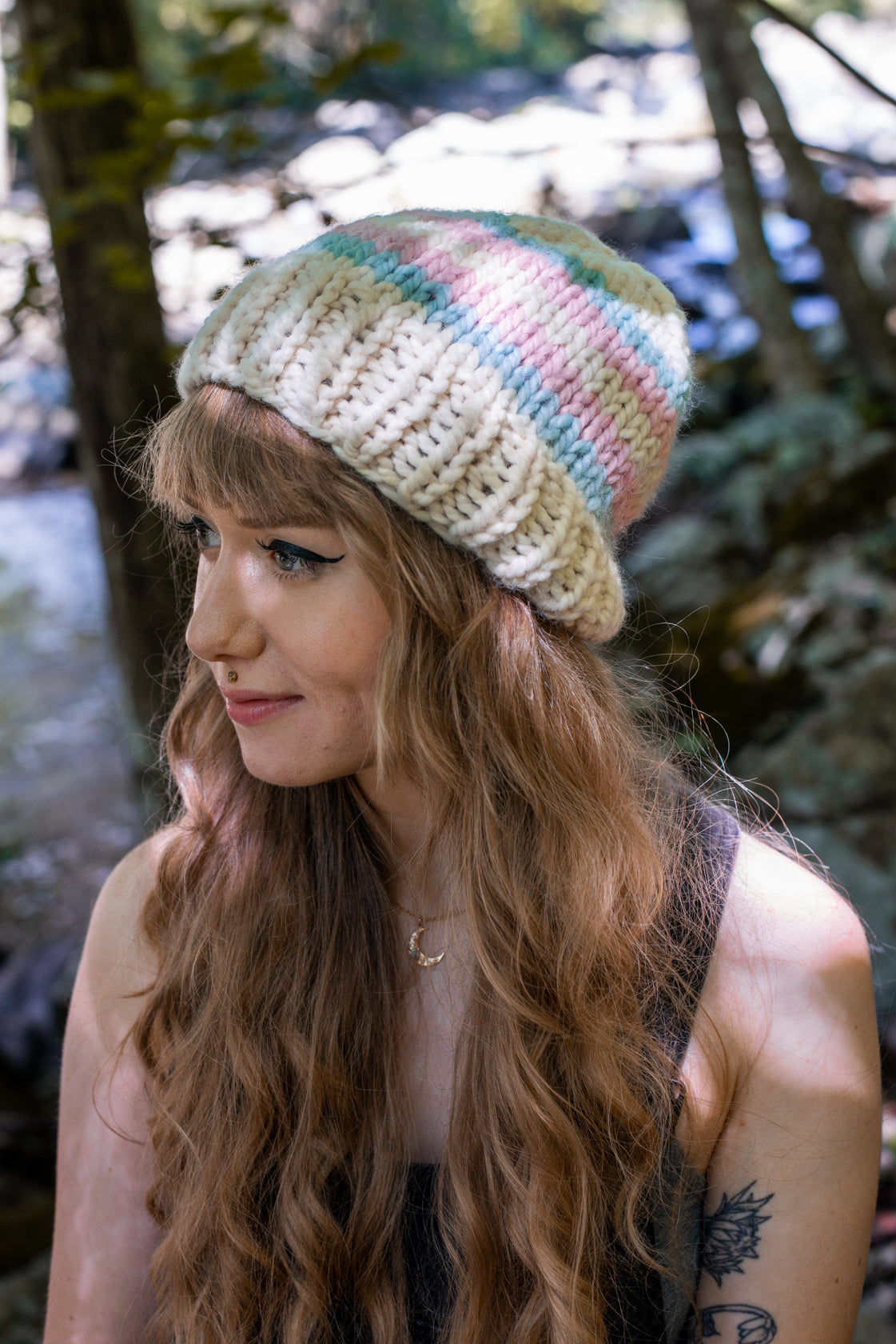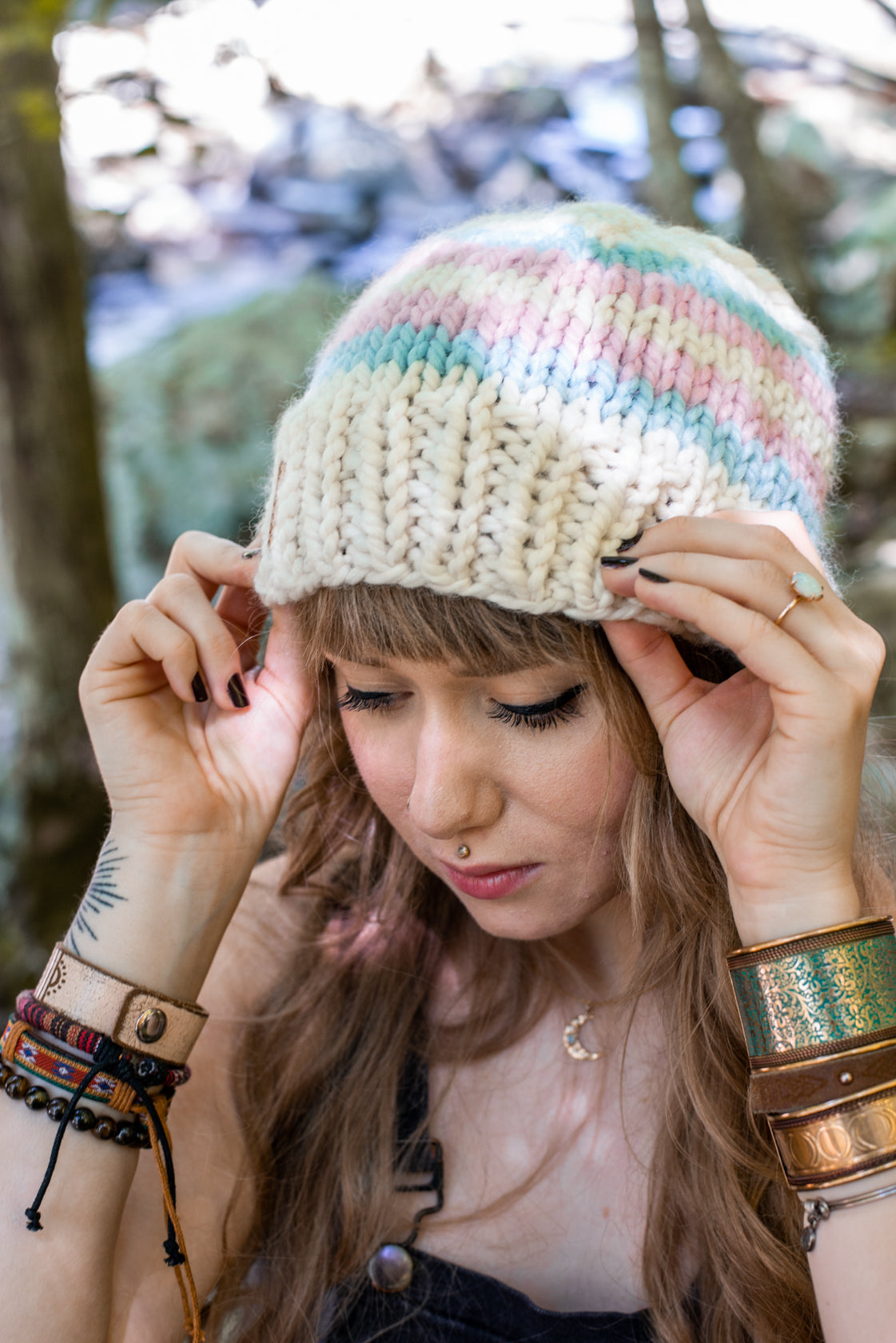 Stay cute and cozy all season with this hand knit, chunky beanie. Featuring a Trans Flag inspired design, wearing this beanie will show your support for Trans People around the world.